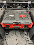 Our Milwaukee Packout Mount is the perfect storage solution for your Polaris RZR. This mount uses existing factory mounting holes, so no drilling is required. You can also purchase our mounting system to bolt the Packout Mount directly to your bed. Installation is quick and simple. We CNC laser-cut each mount in-house from 10-gauge P.O. steel and finish it with a durable black powder coat. This version sits approximately 4.5" above the bed and is considered our tall model, providing clearance for full-size storage boxes and additional space underneath.