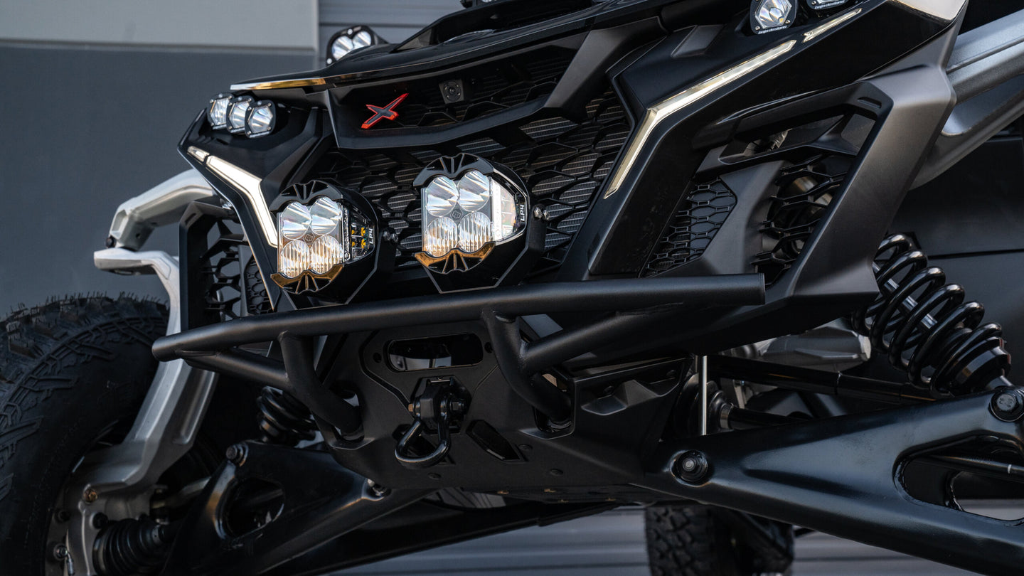 Baja Designs is proud to introduce a bolt-on Pre-Runner Bumper Kit for the Can-Am Maverick R, designed to compliment the aggressive styling of the vehicle. Not only does it provide ultimate protection on the front of the Maverick R, but it is an exceptional mounting solution for the selection of Baja Designs lights, from the Squadron Sport, LP6 to a 10-inch OnX6+ light bar. The pre-runner bumper is perfect for those who want a minimalist Baja inspired bumper while providing that extra layer of protection. Experience the assurance of our 30-day satisfaction guarantee and lifetime limited warranty, providing unparalleled protection for your kit.