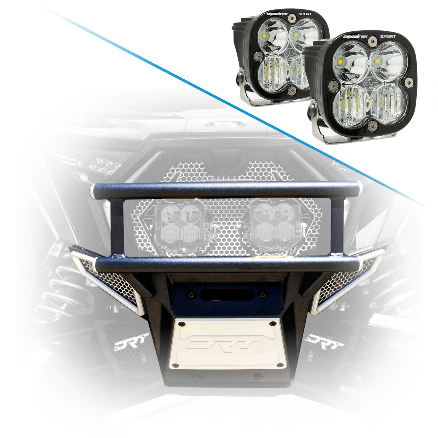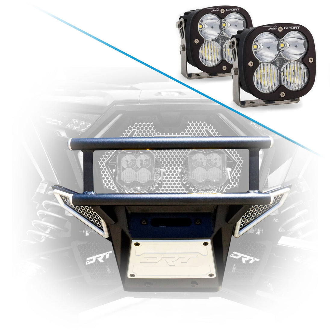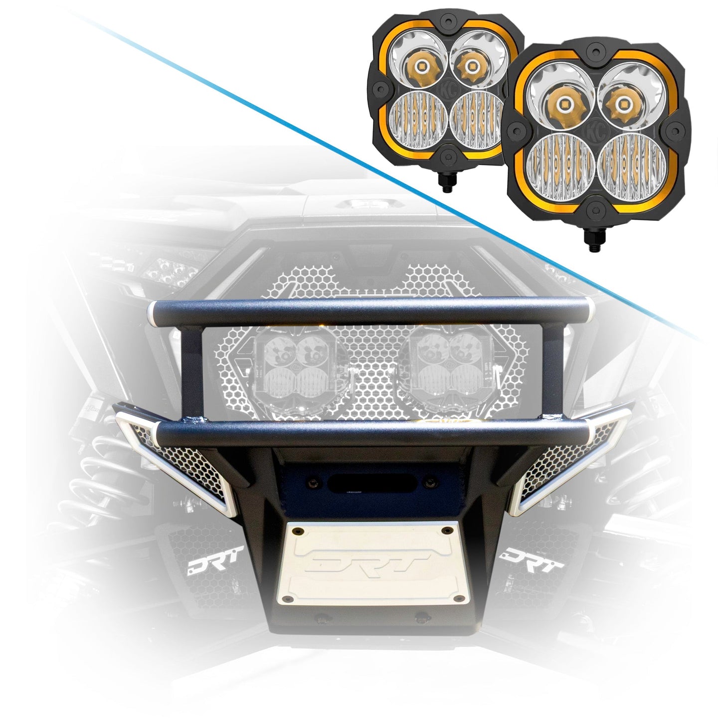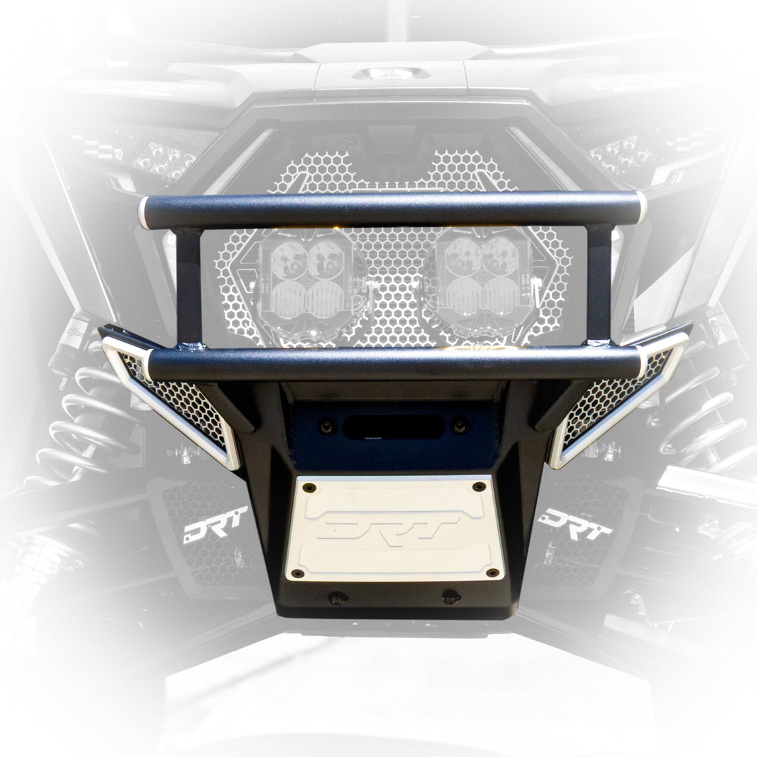 Inspired by Baja racing, the double-row radiused tube structure offers maximum defense for critical front-end components. Each tube is finished with CNC-machined billet aluminum end caps, proudly engraved with the DRT logo. Side wing mesh panels are laser-cut aluminum, trimmed with precision-machined billet bezels to ensure airflow while maintaining rugged protection.