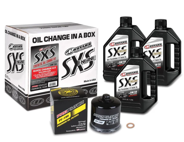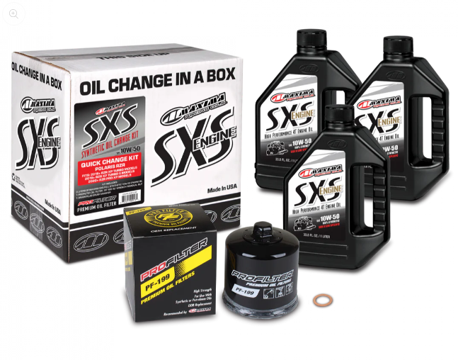 Polaris RZR Turbo Quick Change Kit includes all products necessary to complete an oil change on your Polaris RZR Turbo Side-by-Side. 3 liters of Maxima SXS Full Synthetic 5W-50 or 10W-50 engine oil, ProFilter Premium Spin-On Oil Filter with wrench removal nut (PF-199) and drain plug crush washer. Meets or exceeds all manufacturers’ specifications and will not void your new vehicle warranty.