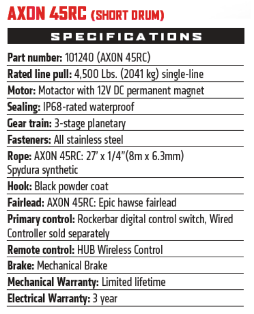 - AXON 45RC includes 27’ of lightweight, easy-to-handle ¼” Spydura synthetic rope, an Epic hawse fairlead, and a black hook
