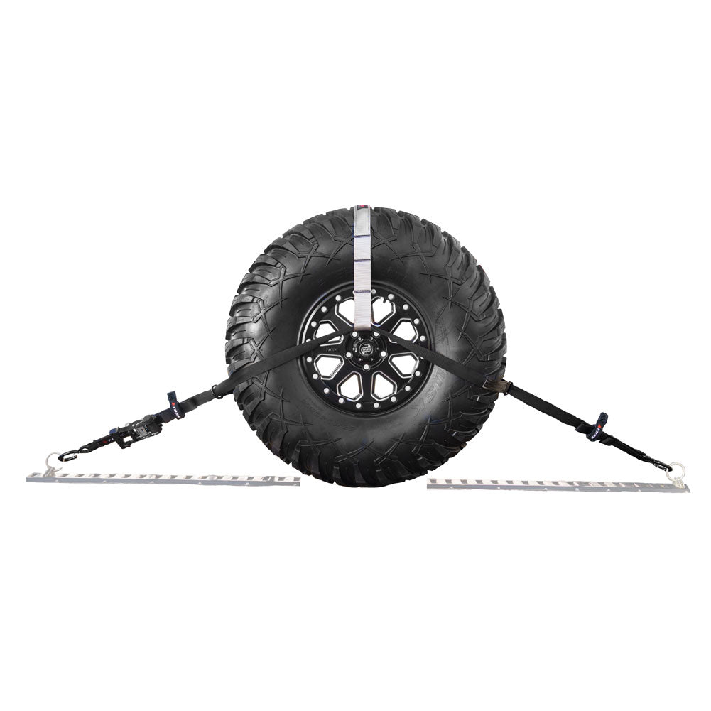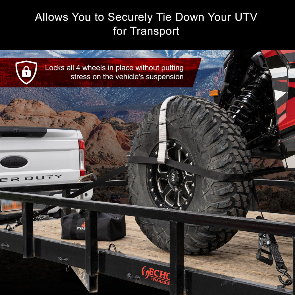 • Front tire bonnets encircle the 2 front wheels while the 2 dual-purpose rear straps can either secure the wheel, A-Arm, or any other strap location.