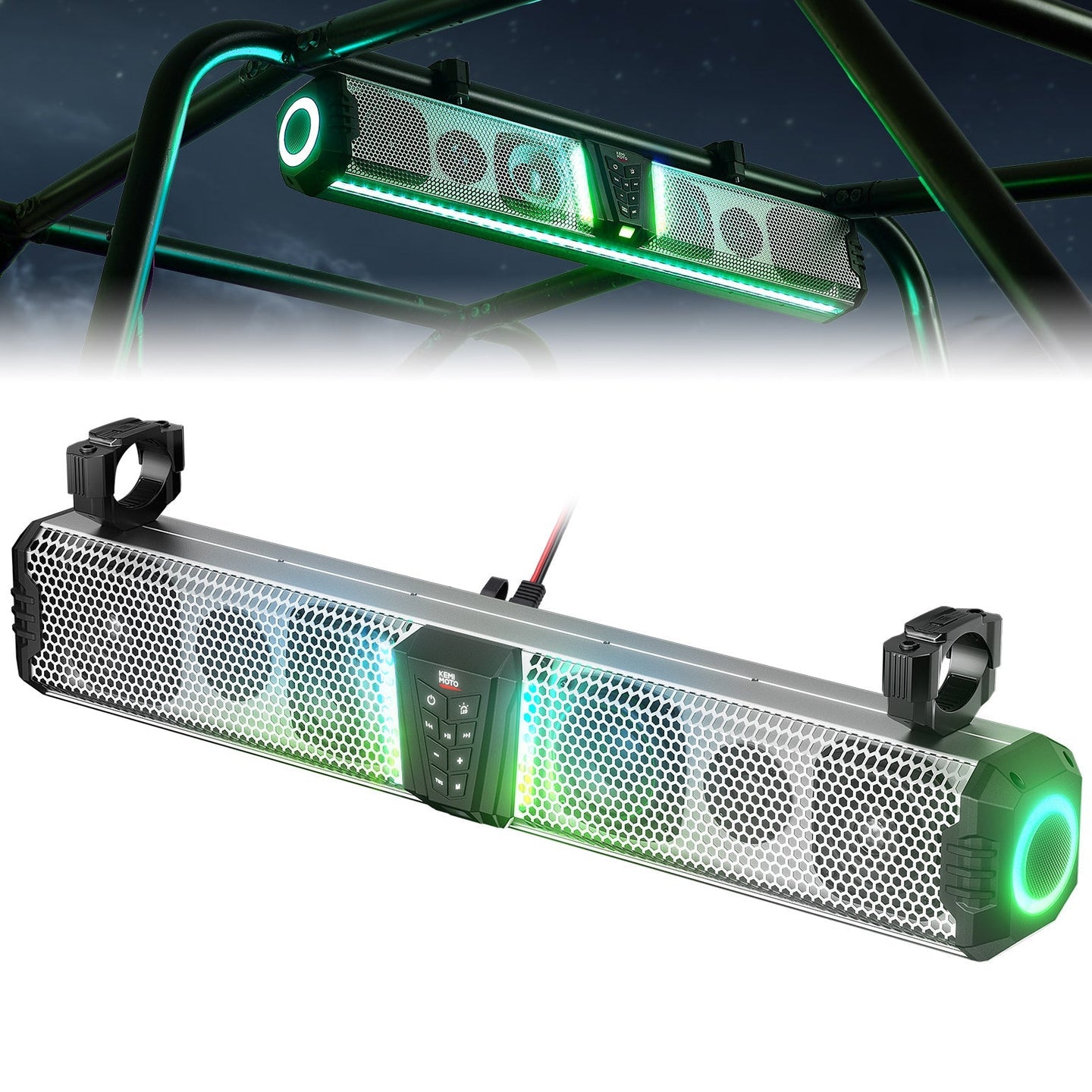 Designed for easier life on the go, the KEMIMOTO Soundbar can be installed without drilling, allowing you to enjoy your favorite tunes in just 20 minutes, saving you time. With dimensions of L26" x W4.6" x H5.0" and compatibility with 1 inch to 2 inches roll cages, the speaker bar can be mounted on UTVs, golf carts, ATVs, or marine boats.?